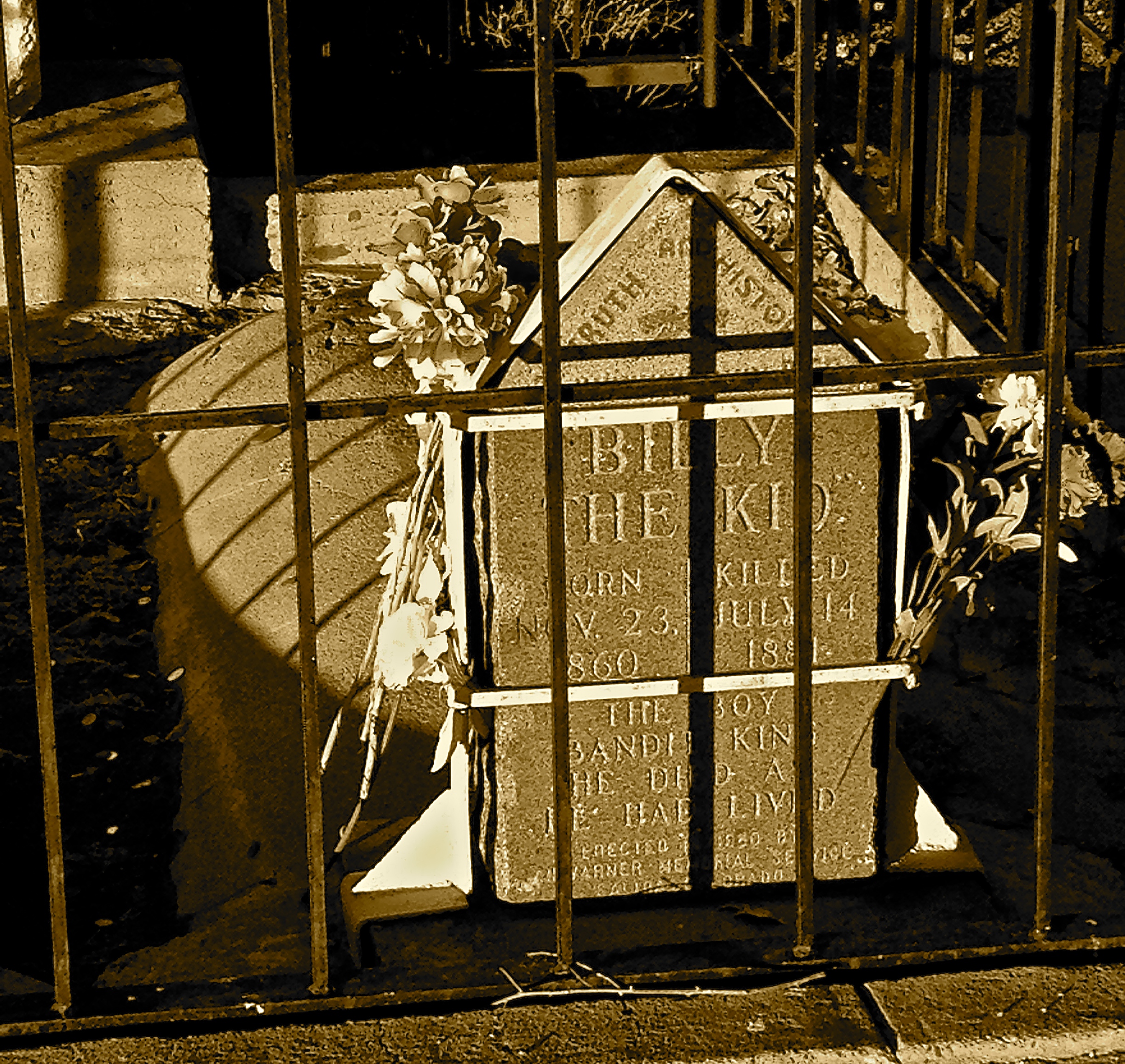 Next morning, the snow melted, we drove south into Fort Sumner, followed a two-lane country road for three miles, and pulled into the gravel lot at the Billy The Kid Museum and burial site. The signs tell visitors that this is the “real” gravesite of Billy The Kid, which suggests that there are charlatans around faking Billy’s final resting place. Strange behavior, but certainly no worse than the appalling case of failed robber Elmer McCurdy, who was killed in a shootout with the law in 1911, and whose embalmed remains were found sixty five years later, hanging in a Long Beach, California, funhouse, during filming for an episode of the “Six Million Dollar Man.” For years, visitors and vendors alike supposed McCurdy to be a wax mannequin. Alas, it was only Elmer, embalmed and mummified. Billy, famously killed by Sheriff Pat Garrett, was given a proper bandit’s burial, and was eventually joined by his best friends in life, Charlie Bowdre and Tom O’Folliard, whose graves make up the trifecta, caged against repeated headstone thefts and attempts to dig up the deceased. Because it was early we couldn’t get in the museum, but we paid our respects to Billy, and because it seemed to be what people do, I flipped a nickel into the cage, onto the concrete mound entombing young William Bonney for eternity.